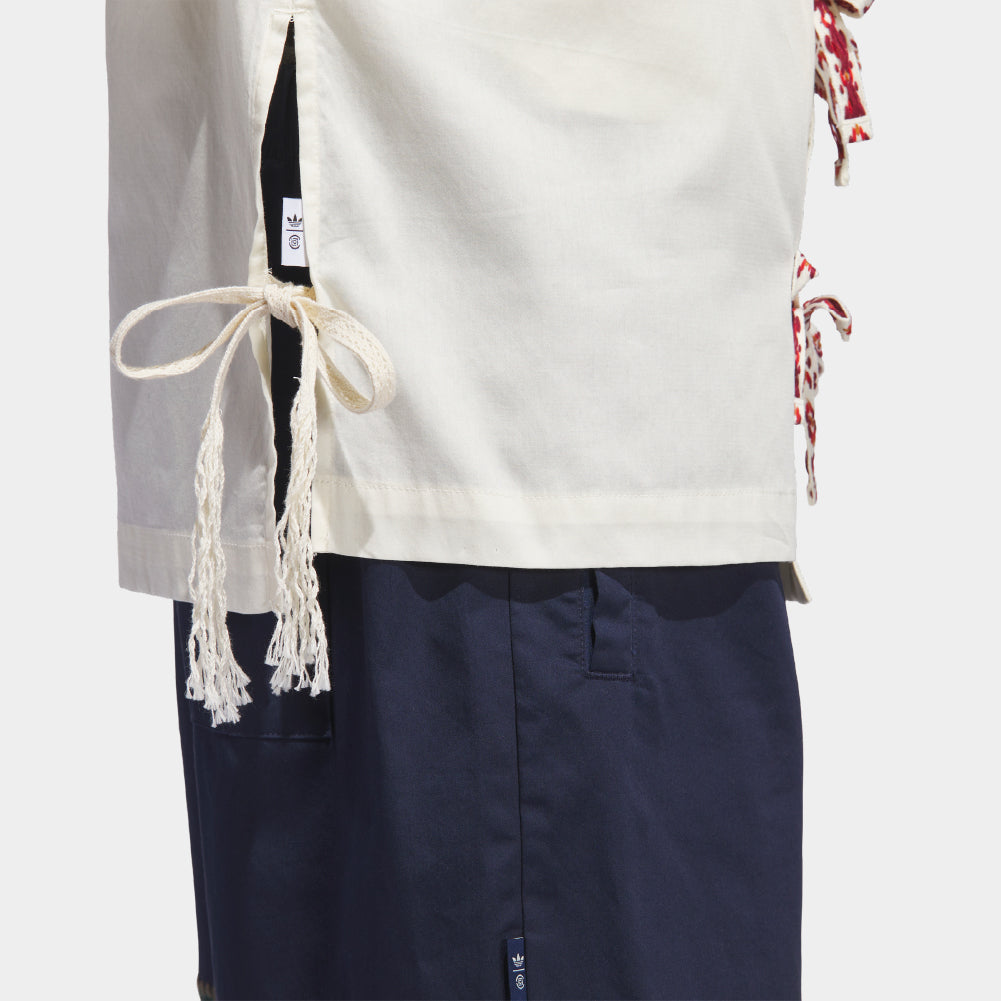 Ease and elegance are what you feel when you slip on the Bowling Shirt, which weaves traditional Tibetan vibrancy into the silhouette. It's detailed with a cotton satin crosshatch, a graphic print on the ties and lace trim and some CLOT and adidas branding.
