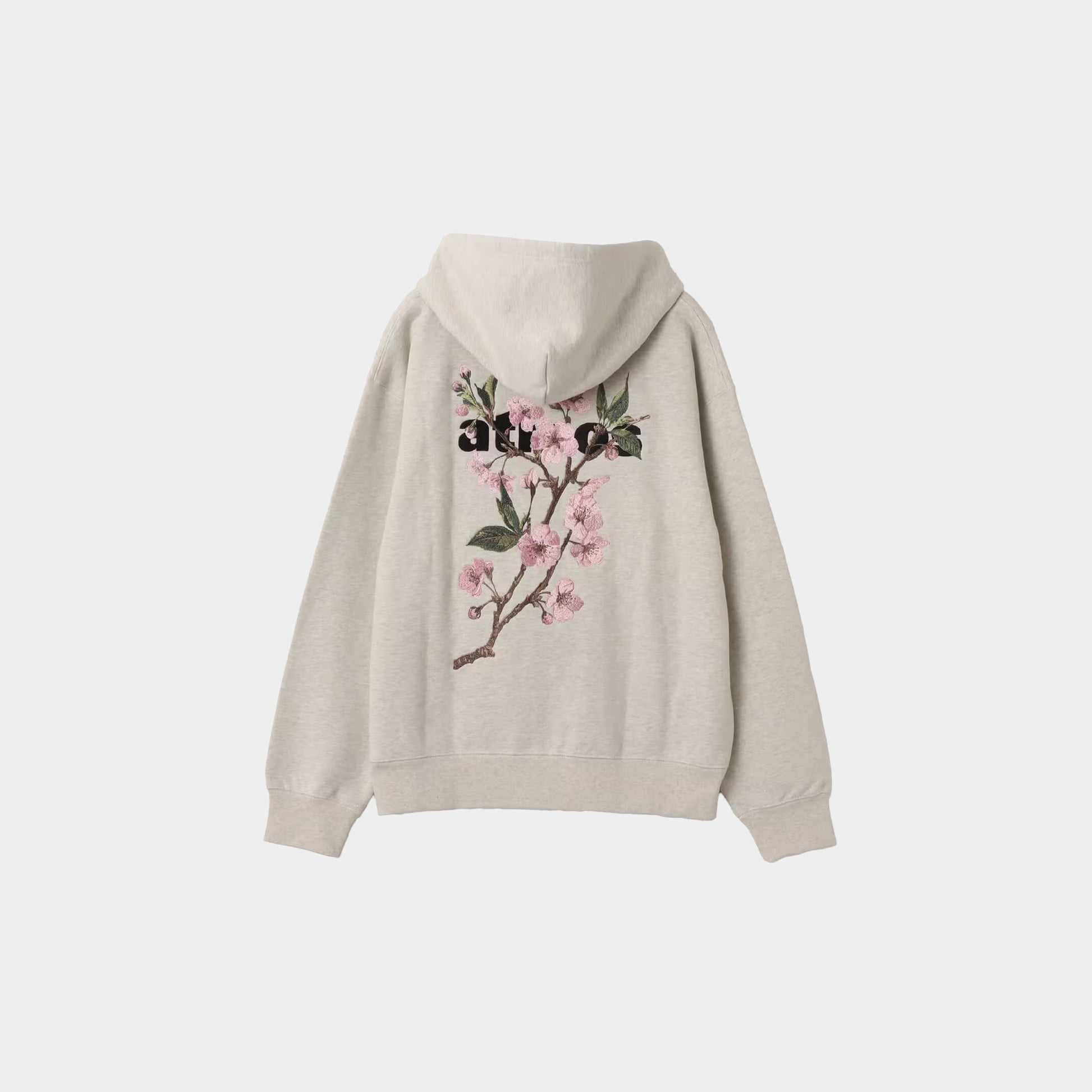 This zip-up hoodie features a large cherry blossom embroidery layered over the classic atmos logo. The atmos logo is embroidered on the front. The body is made of heavy-weight fleece fabric, which uses open-end yarn to create a moderately rough and voluminous feel. The moderately loose silhouette provides a relaxed fit.