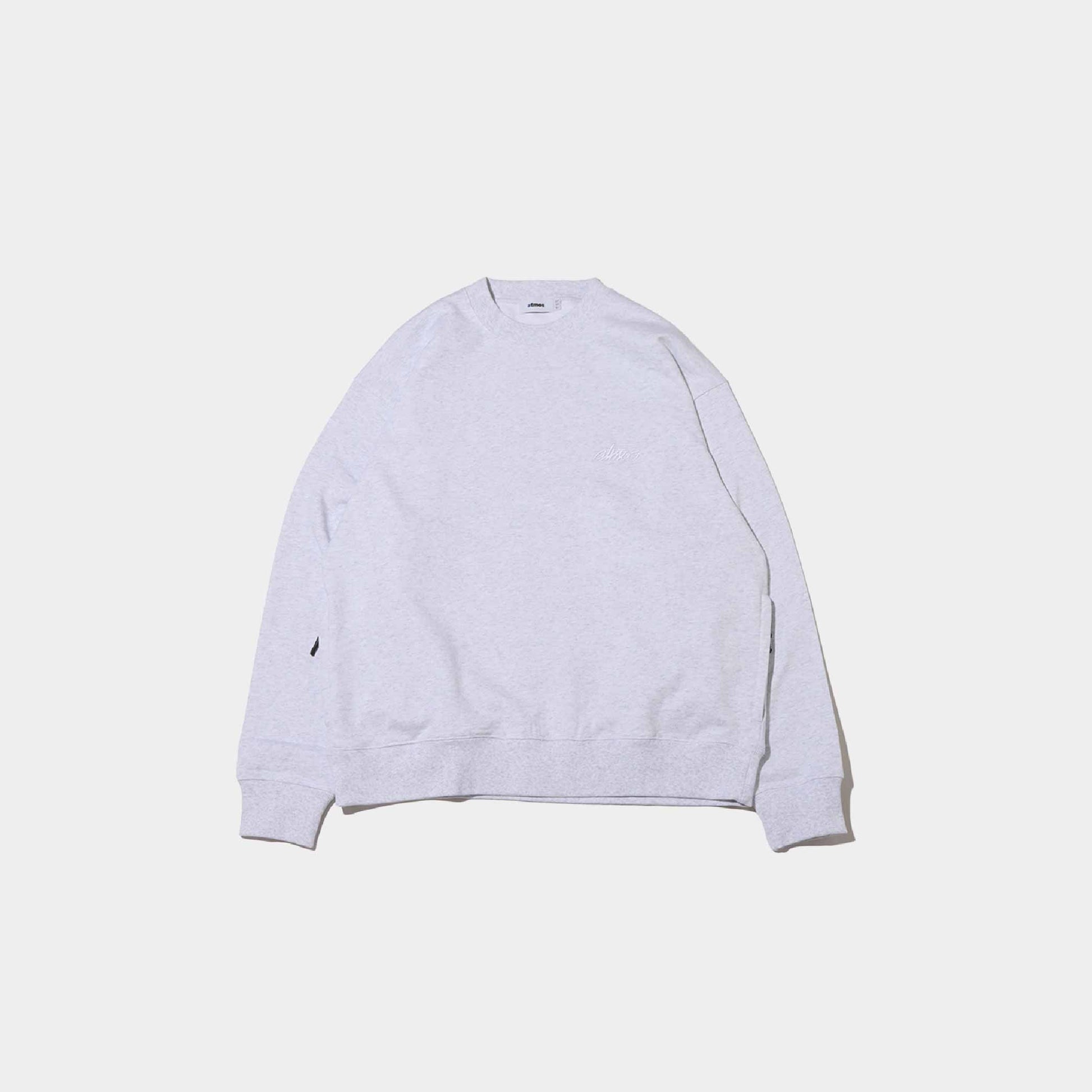 Crew neck sweatshirt with 3D embroidery of the atmos logo on the left chest. It also has a zippered pocket on the side, making it a simple yet highly versatile item. The outer fabric uses open-end yarn to give it a moderately rough feel, while the fleece material creates spaces between the fibers, giving it the right amount of volume.