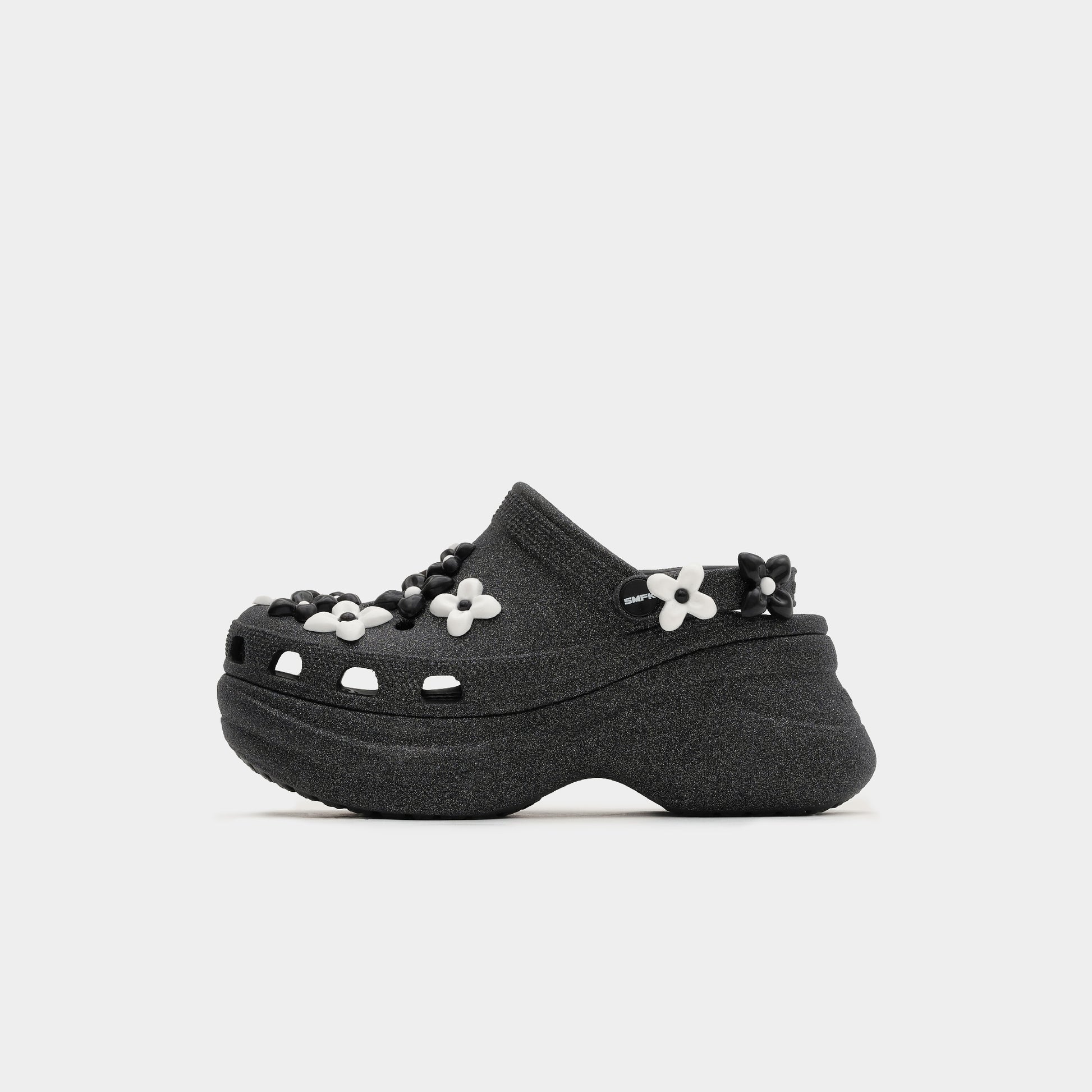 The co-branded collection reimagines the classic Crocs Echo Clog with SMFK’s distinctive design elements, resulting in a fusion of retro style and futuristic streetwear. Offered in timeless black and white, along with a stylish silver variant, the collection caters to fashion-forward individuals. The upper features SMFK’s signature Compass Cross and Garden Black motifs in a striking 3D design, adding a bold and eye-catching touch.