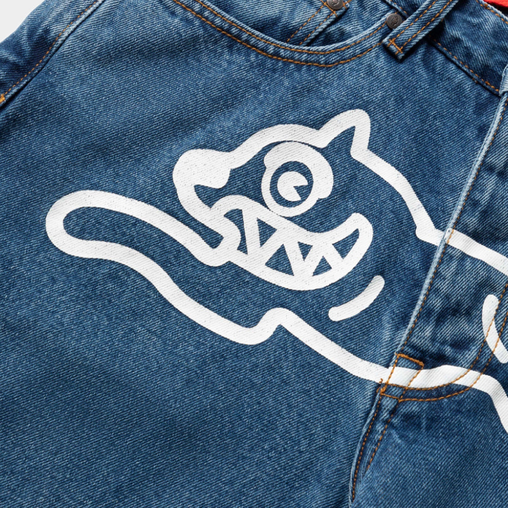 Stay on trend with Icecream's Big Boi Jean Shorts. These blue jean shorts feature the iconic screen-printed Running Dog graphic in white on the crotch. These 100% cotton shorts are comfortable and durable to give your wardrobe a must-have addition. With a longer length past the knee, you'll be stylish and comfortable all day long.