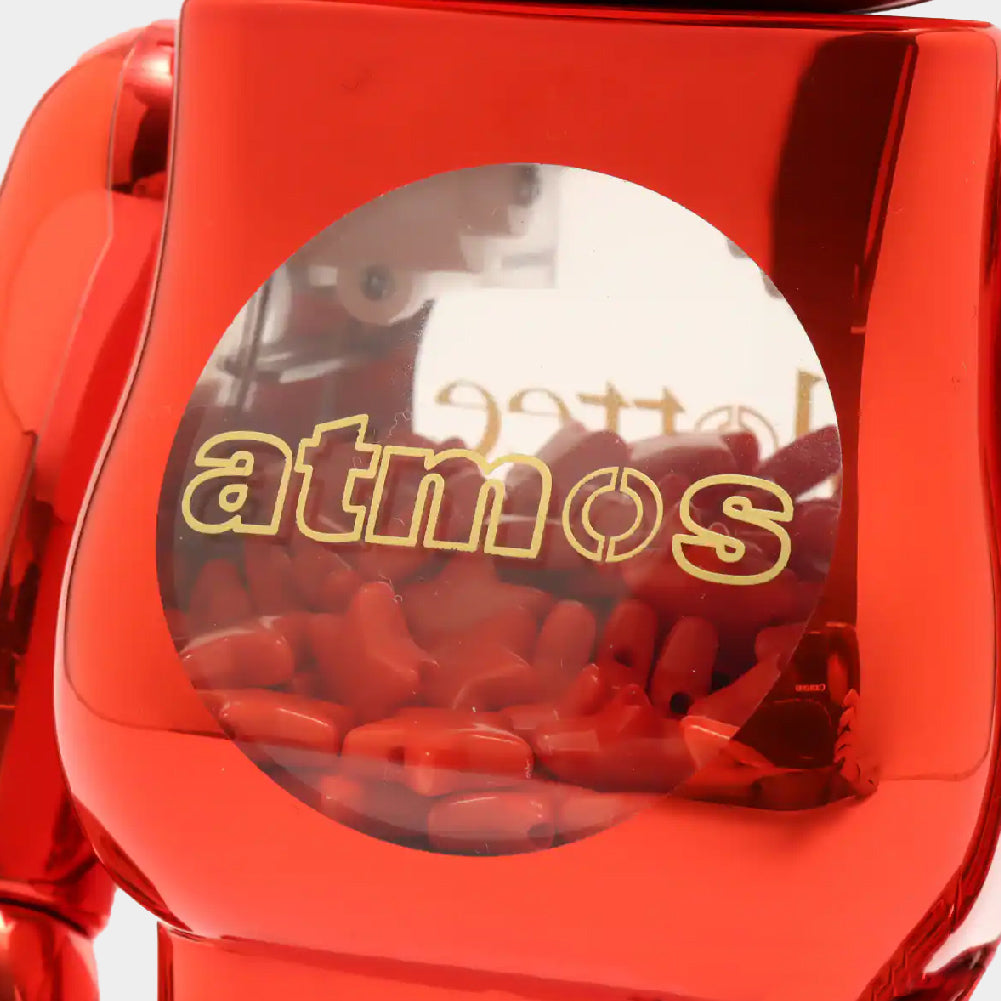 metallic texture of the "BE@RBRICK" is dyed deep crimson red, with the "atmos" and "Clottee" logos on the abdomen and back. The interior is filled with star chip parts, and the face features the brand's initials, a C (playing on the character for "China"), and a star pattern, paying homage to Chinese New Year.